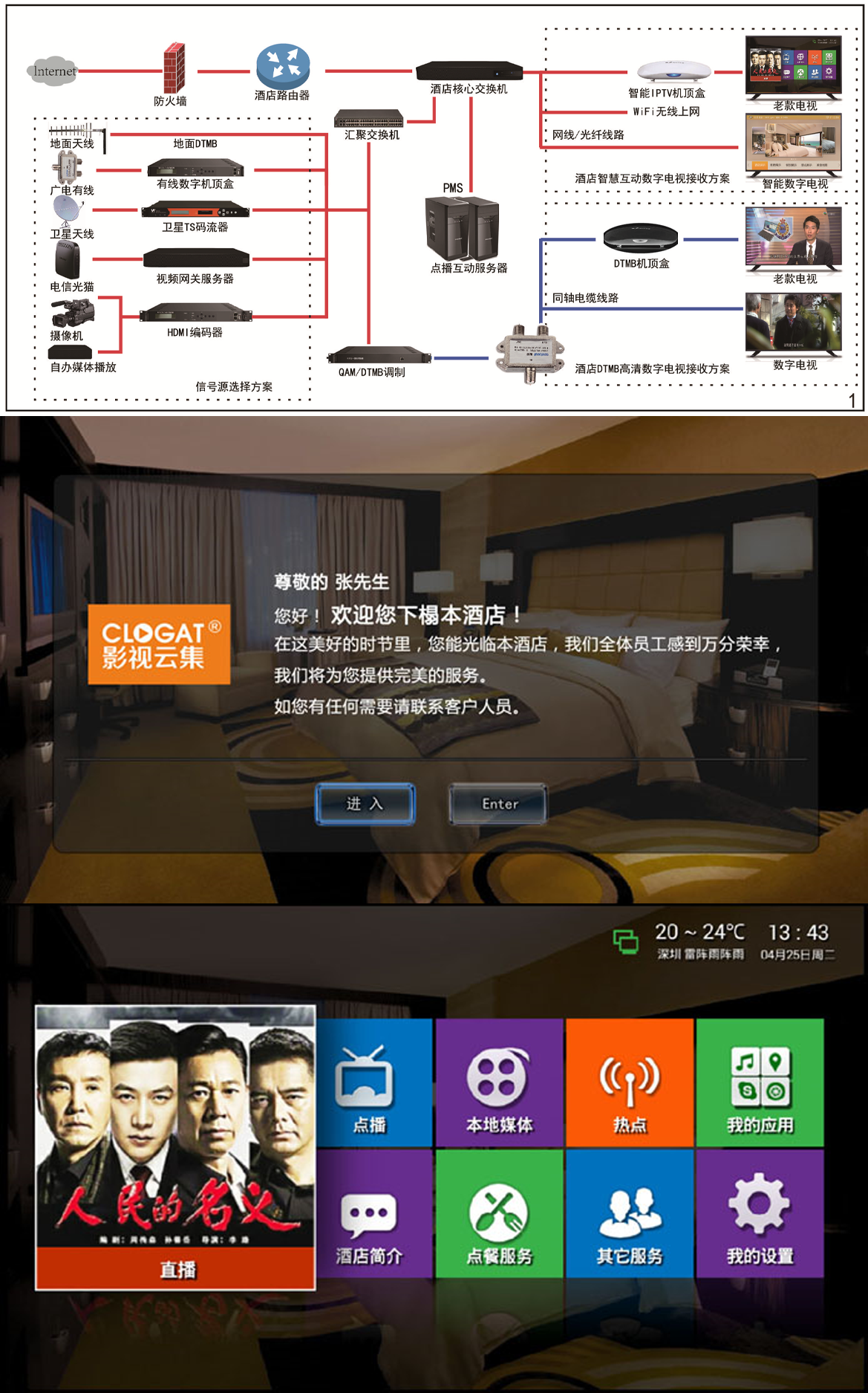 系统可扩容与酒店前台系统对接互动增值业务、集直播电视、影视点播、商业广告与综合信息服务、自助结账等智能管理功能、不用对原线路改动同样可传送高清数字电视信号、降低经营成本和维护管理、收看的是无干扰高清数字电视节目。