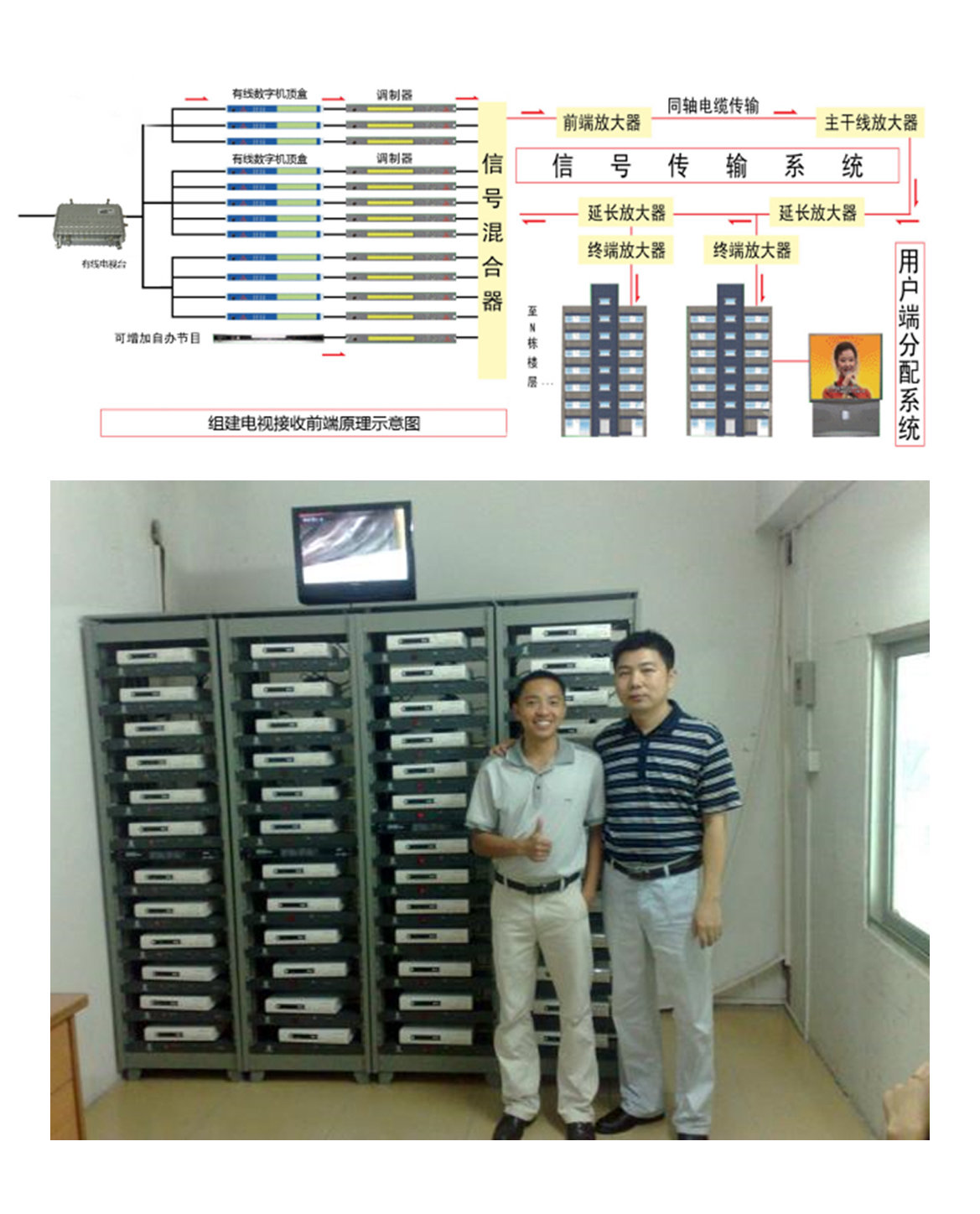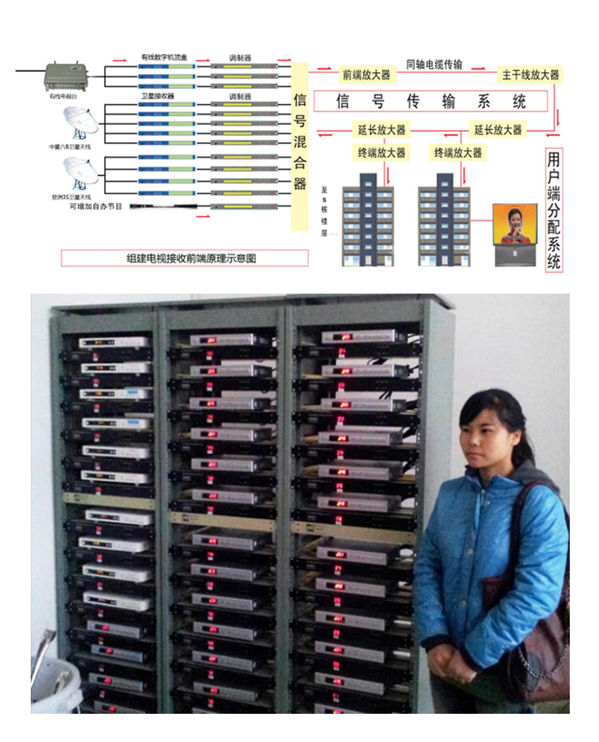 1.用小部份有线数字机顶盒集中在起一做节目源(一个节目需配一台机顶盒)、如电视有40个节目就需要用40台数字机顶盒来做前端转换调制