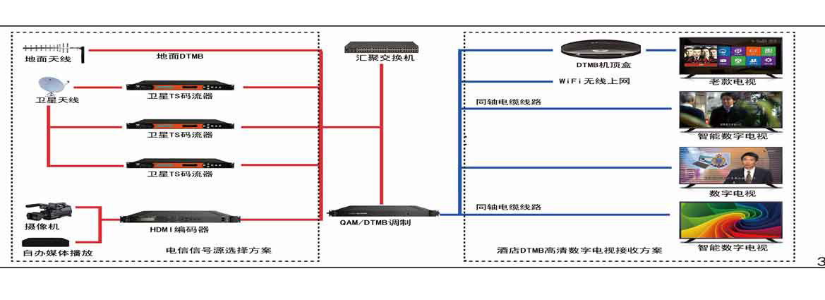电视基本功能:接收不同方向卫星电视节目或境外卫星节目、采用一至两台4路国标综合接收一体机和一台8路数字编码器、同时可混入当地地面波节目进行节目选择复用、调制输出国标DTMB射频信号、传输至酒店会所等内部原有线电视线路。
